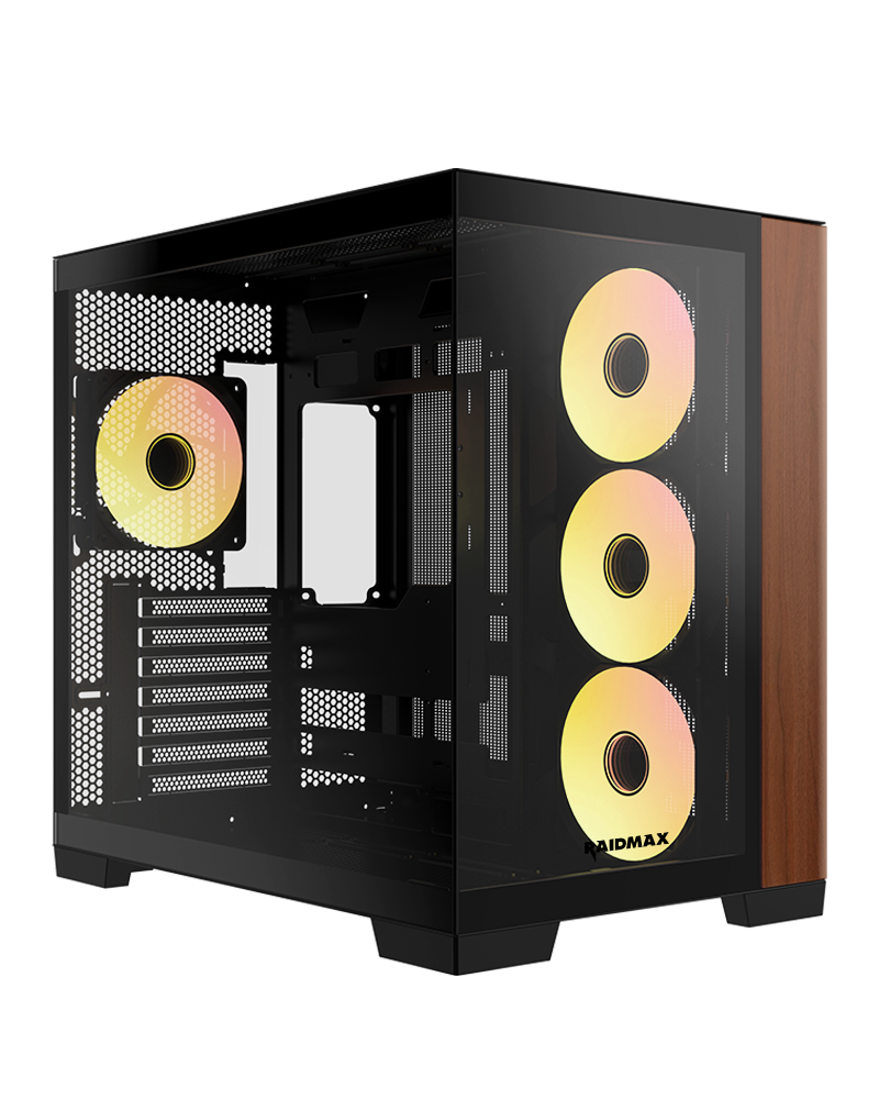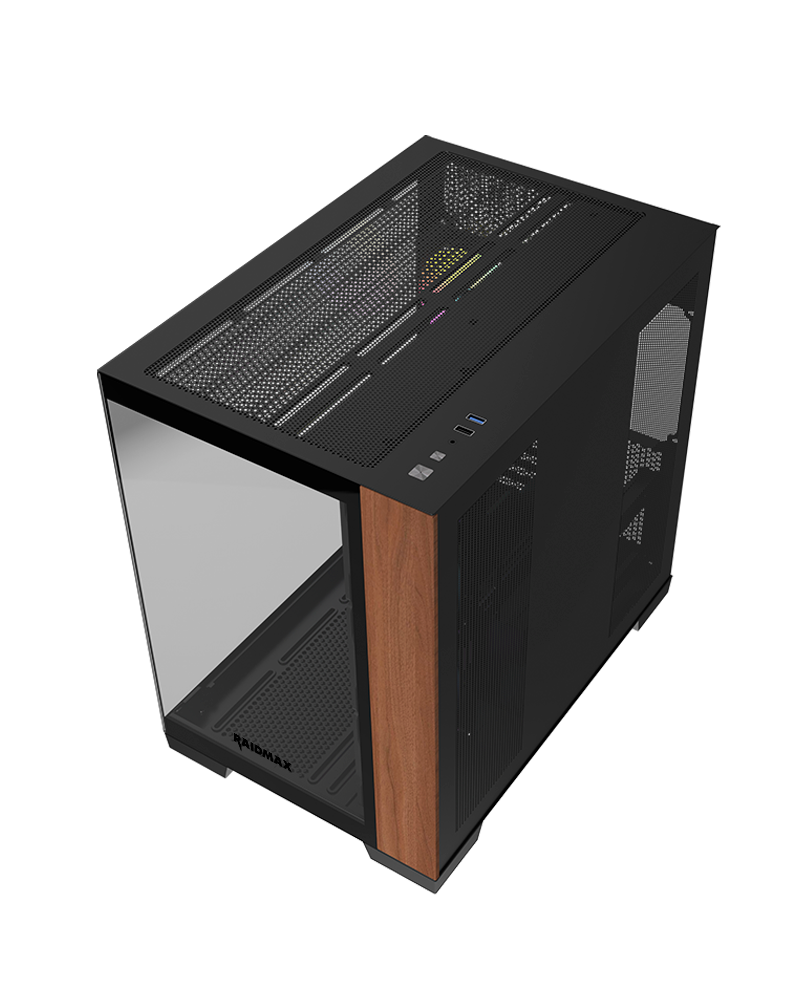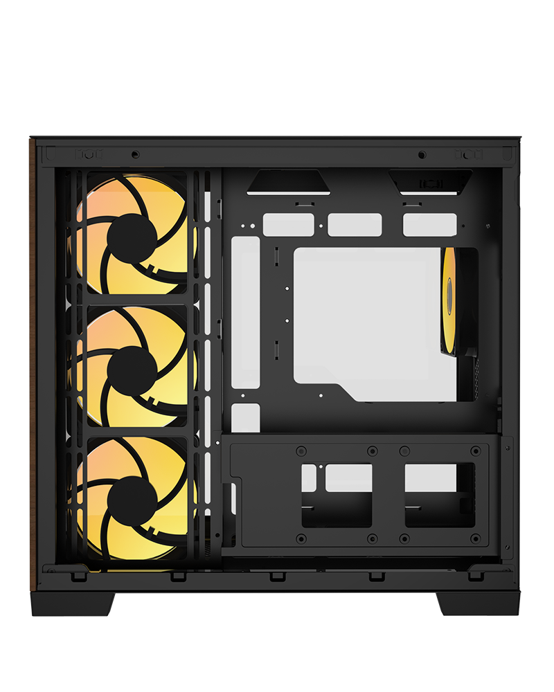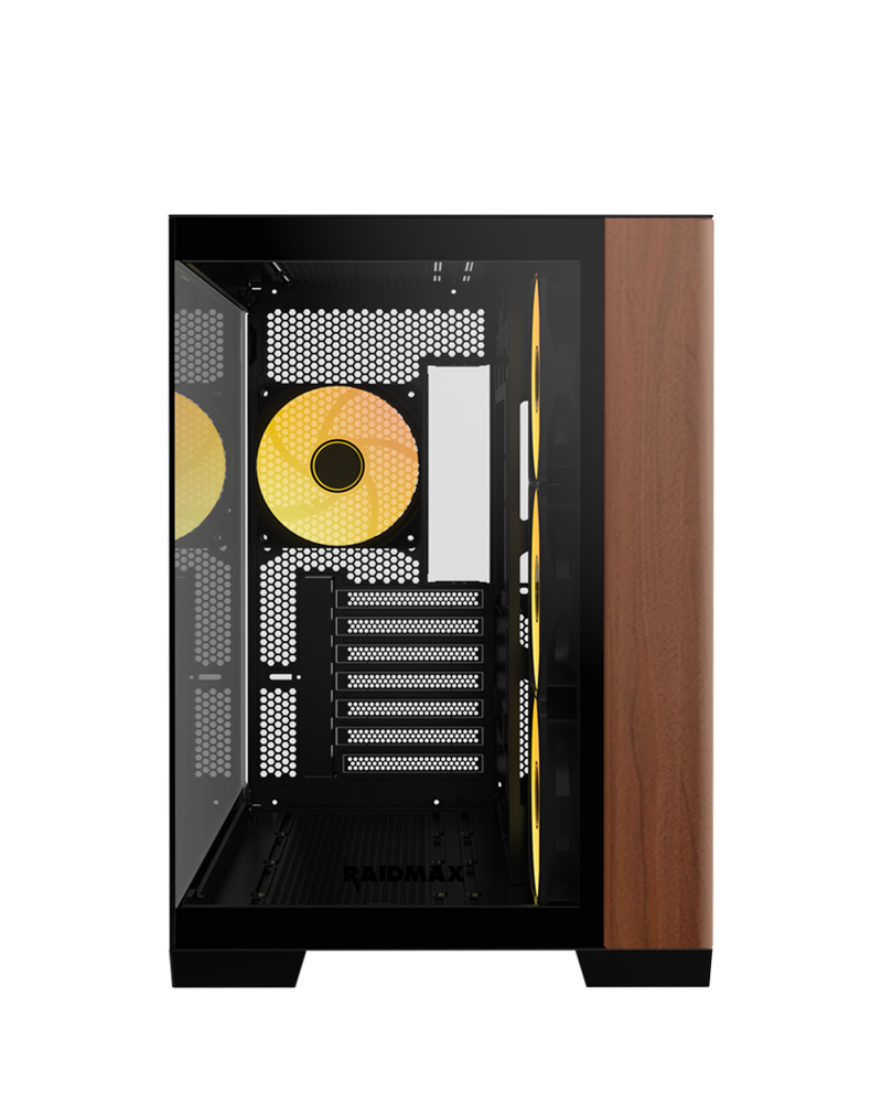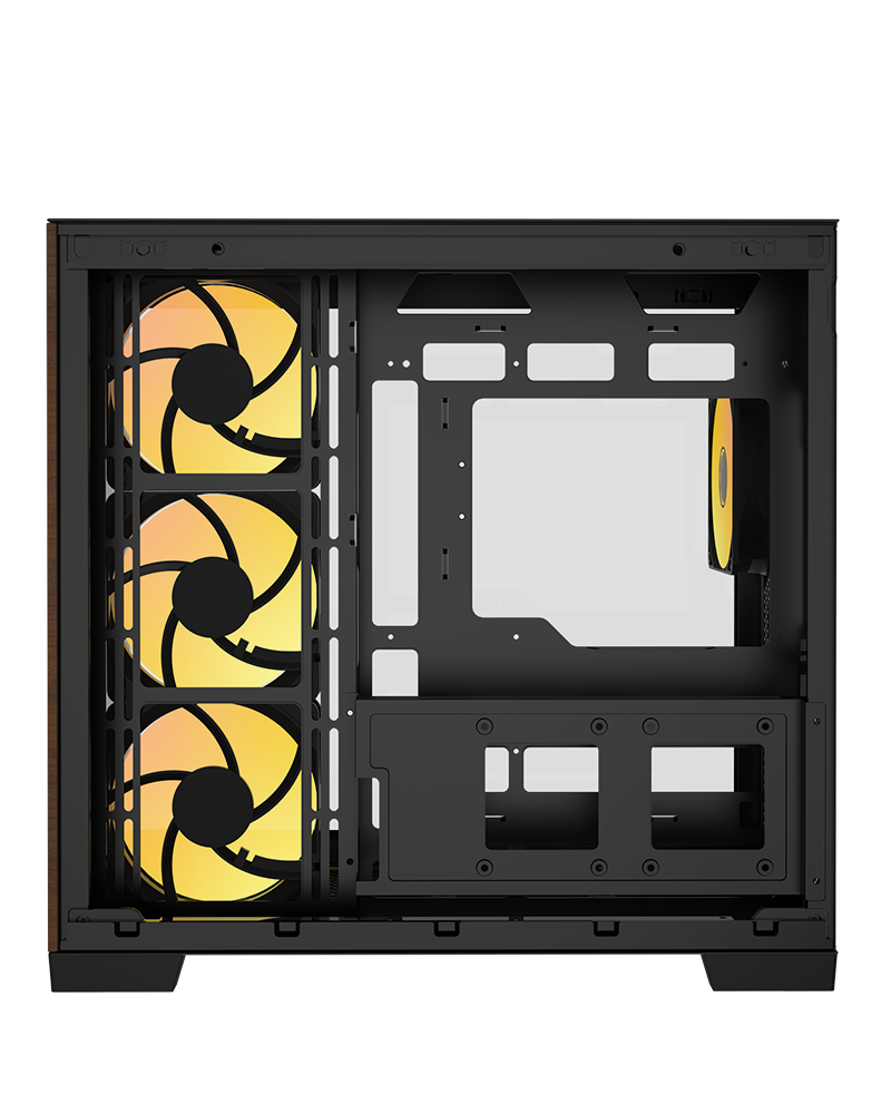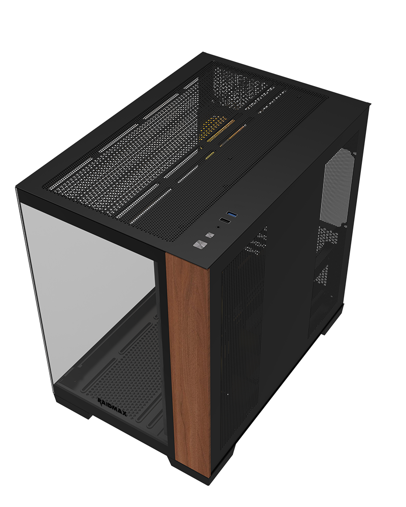 Elevate your gaming setup with a frameless dual-chamber crystal design, combining superior airflow and cable management with a full view of your components. The elegant wood accents add a refined touch, making this the perfect fusion of performance and style for any gamer.